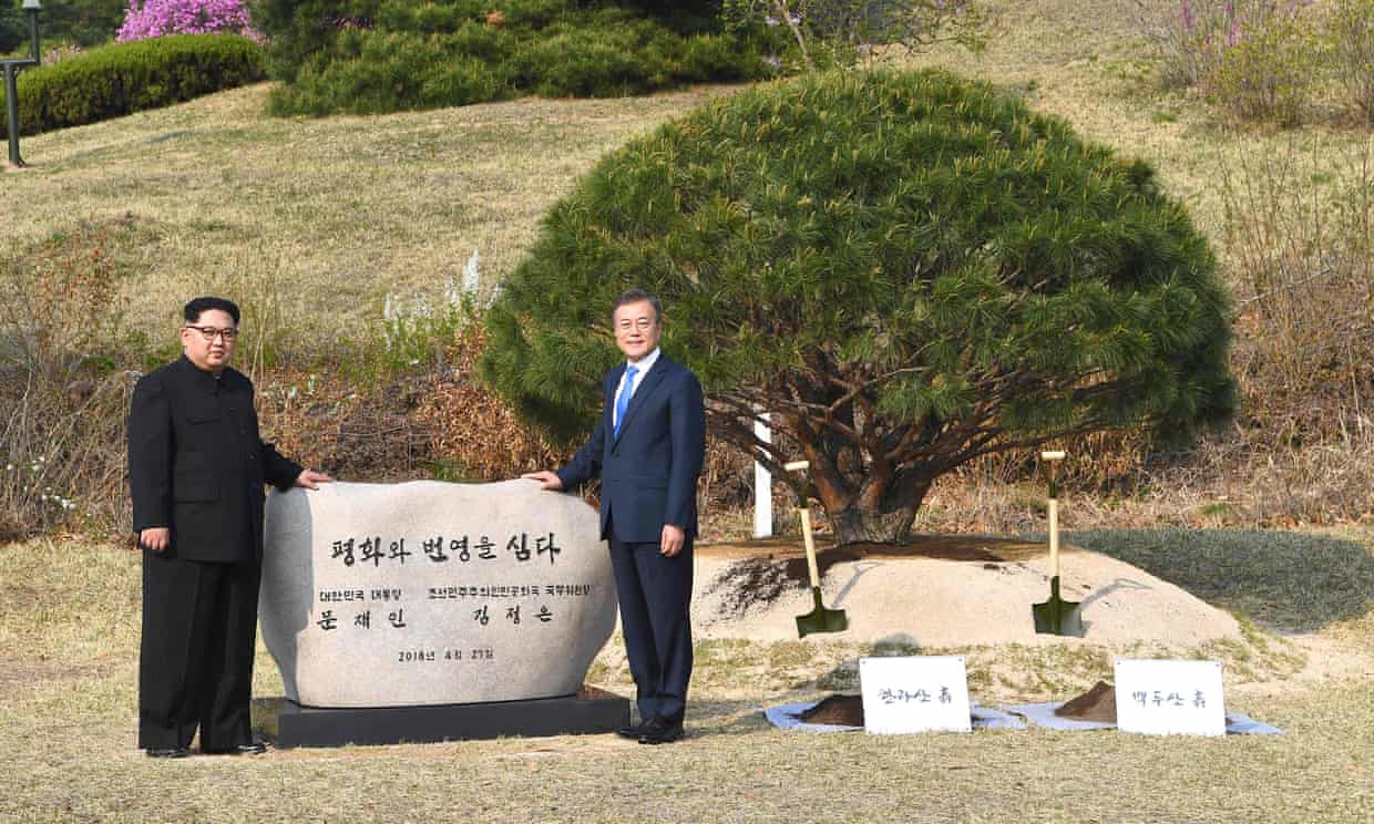 وزرع القائدان في وقت سابق شجرة، وكشفا عن حجر كتب عليه “زرع السلام والأزدهار”، ثم سارا قليلا بجانب الحدود وجلسا على مقعدين على ممشى خشبي.