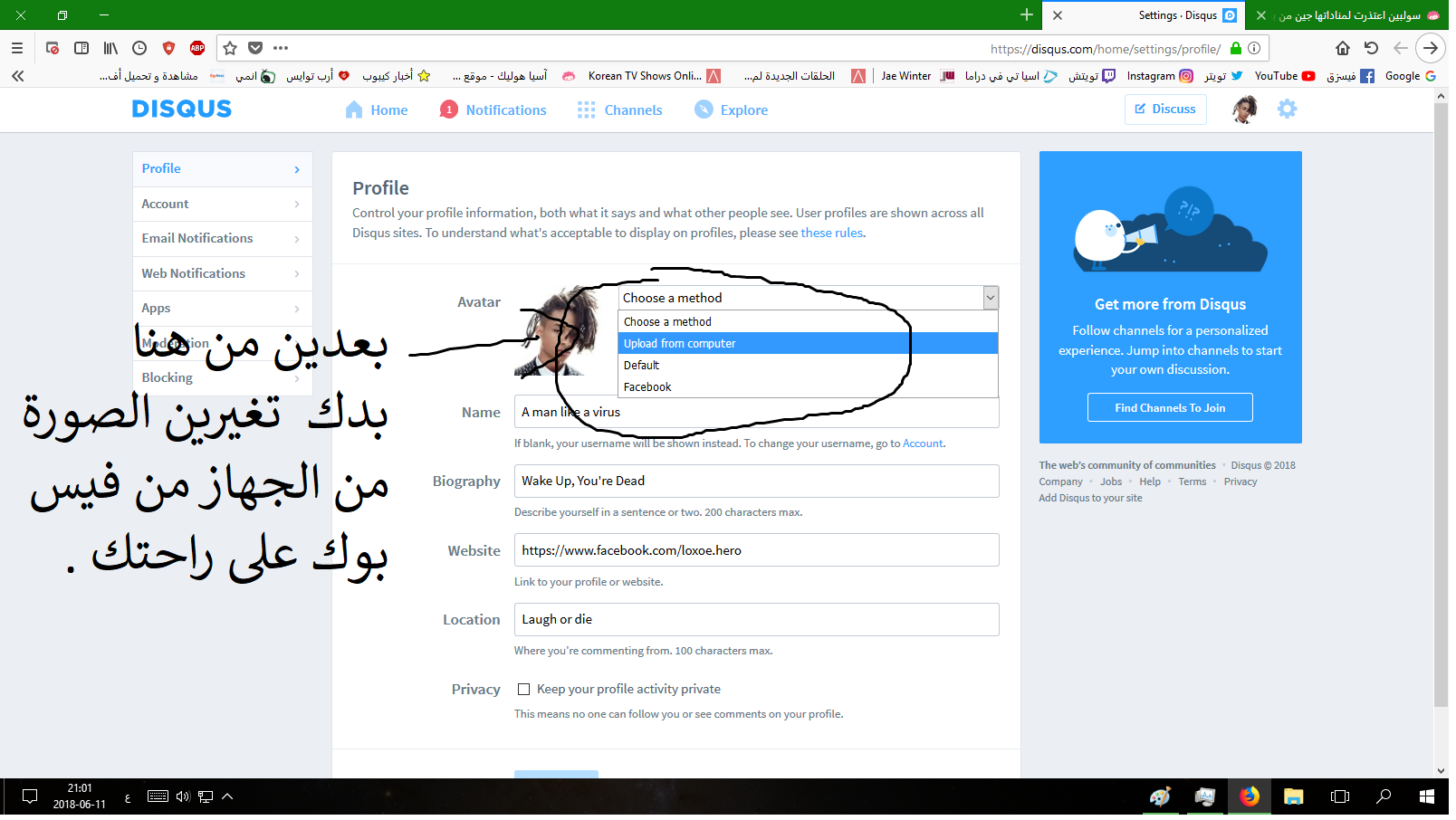 اضغطي على صورتك بعدين تأخذك صفحة على يمينك تلقي بروفايلك سوي ادت لصورة تبعك .