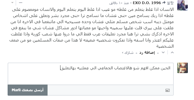 الانسان اذا غلط يتعلم من غلطه مو عيب اذا غلط اليوم يتعلم اليوم والانسان مومعصوم على غلطه اذا ربك يسامح مين حنى عشان ما نسامح ترا حنى مجرد بشر ونعلق على اشخاص مومثل دينه اسب شخص مسلم مثلي عشان وحده مسيحيه الي ماتنفعنا في الاخره انا من علقت على ييري قلت عليها سمينه واحبها مو معناتها ادور مشاكل عشان شي ما ينفع في الاخره اذكرك بشي ترا هنا مجرد تعليقات عرب فقط الي ما دروا عنها شعب كورية واذا غلطت عليكم اعتذر وانا اسفه واذا تفكرون شخصيه ضعيفه لا هذا من صفات المسلمين مو من ضعف الشخصية
