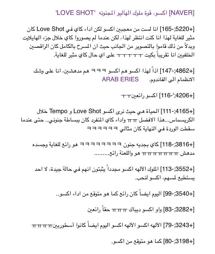 أنا أرمي، ولكن هذا الكلام غير صحيح فإكسو قدموا أداء جيدا مثل بي تي أس تمام، كلتا الفرقتين رائعتين ولديها أسلوبها الخاص، وكلتا الأسلوبين رائع، لا أعرف لماذا يحقدون على إكسو، إنهم جيدون وموهوبين أيضا لا يجب أن ننكر ذلك مثل بي تي أس تماما، وفي هذا الحفل كان أداء إكسو رائع، توقفوا عن التقليل من شأن الفرق الأخرى، كل فرقة لديها ميزاتها الخاصة بها تمتاز بها عن غيرها ، أنا أرمي ولكن لا أرضى بهذا الكلام.