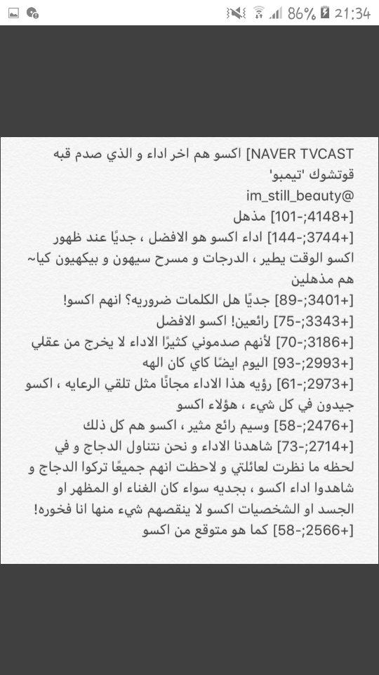 - [+237, -76] لكن هل سيكونوا إكسو بخير مع الآداء الختامي… آداءهم سيكون بعد أن يقلبوا بانقتان المسرح رأسا على عقب بآداءاتهم…