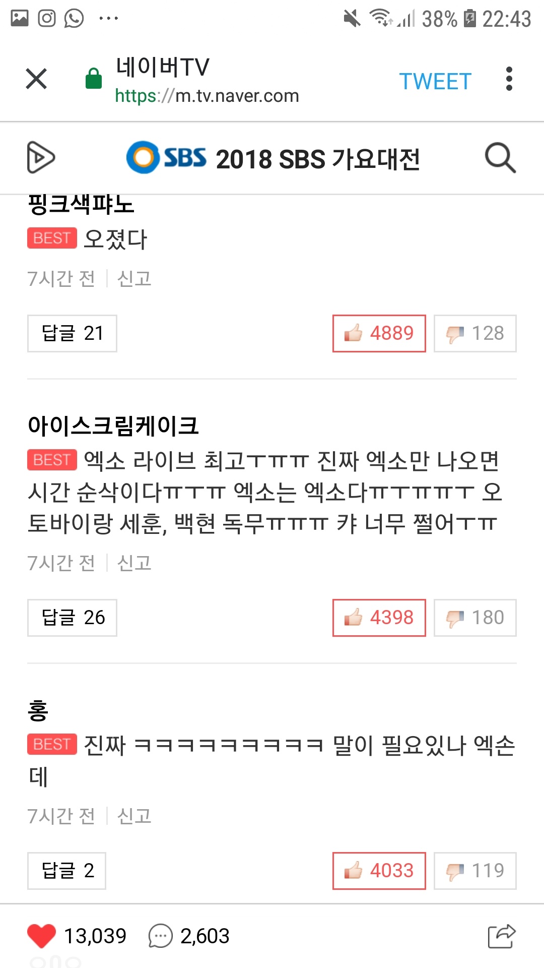 - [+195, -26] بانقتان غنوا ٦ أغاني، وإكسو أغنيتين، والآداء الختامي ذهب لإكسو. يبدو أن SM رفضوا المشاركة في الحفل إلا إن حصلوا على الآداء الختامي.