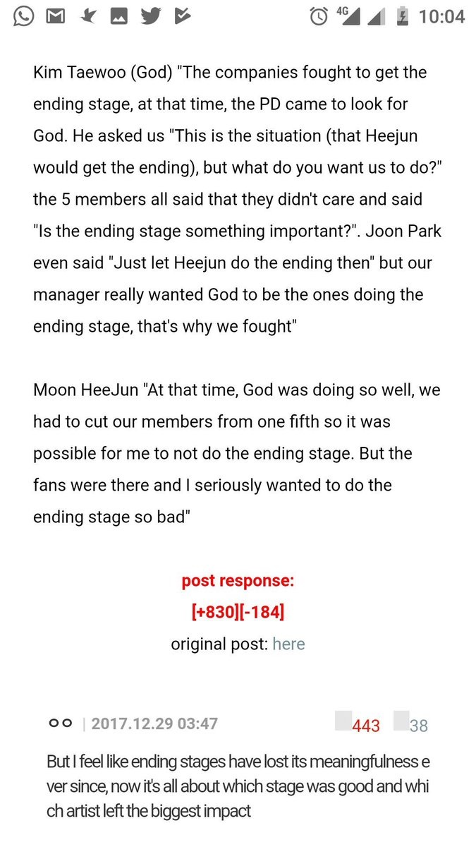 - [+971, -30] أنا أعرف أن الناس مستائين من الآداء الختامي حاليا لكني أعتقد بأنه كان أفضل لفتيان بانقتان أن يرتاحوا في الخلف مع جون هيون مو ويمسحوا عرقهم بدلا من تقديم الآداء الختامي. لقد كان مضحك أيضا رؤية كيف أن بانقتان كانوا الوحيدين الذين انحنوا من أجل السنة الجديدة في النهاية. أحب كيف أنهم مشرقين.