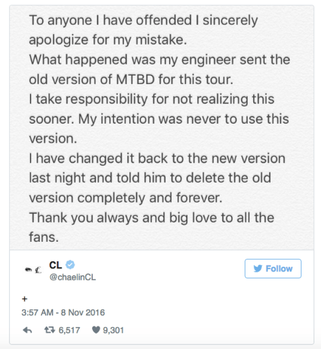 بالله لا تكيسي لا سبت الإسلام و لا شي, السالفة و ما فيها أن ” تيدي ” إلي أنتج الأغنية حط آية قرآنية فيها و لما صار في هجوم و إنتقادات تم إصدار نسخة ثانية من الأغنية بدون الآية القرآنية و النسخة ذي هي إلي كان المفروض تأديها في أداء من جولتها في أمريكا لكن صار خطأ ( الأخطاء ذي تصدر من منظمي الحفل مو من المغني ) و تم تشغيل النسخة القديمة مرة ثانية. طبعا رجعت الإنتقادات مرة أخرى و هنا نزلت إعتذار, هي إلي إعتذرت مو الشركة إعتذرت و لا تم إجبارها.