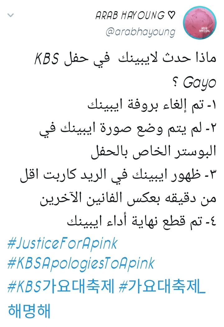 لقراءة الاعتذار تفقدوا هذه المقالة: قناة KBS اعتذرت لفرقة آيبينك عن قطعها لآدائهن في مهرجان KBS الغنائي ٢٠١٩.