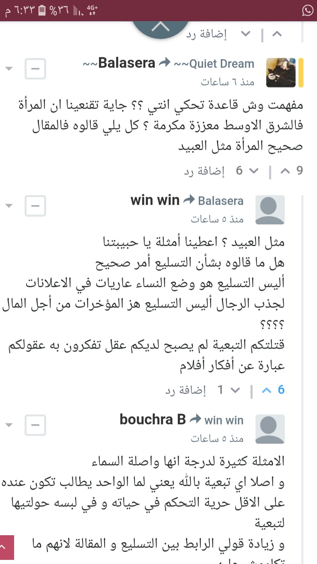 حسنا امممم لا اعرف كيف اعلق حقا ان النساء فى مجتمعنا العربى لا تاخذ ما ينصفها لا اعرف عن العرب الاغنياء او الدول العربية الغنية او التى لا اعلم شىء عنها ساتكلم عن بلدى فقط انا اراى الرجال يضربون زوجتهم فى الشارع امام الناس مع الفاظ ارتجف حقا واحزن لسمعها ارى الرجال يدفعون النساء فى الطوابير حتى يمشوا اولا ارى الرجال يسبون النساء فى الموصلات ولا احد يتدخل ارى الرجال الذين يخبرونا ما اهميتنا لما لا تبقوا فى بيتكم فمكانكم بالمطبخ ارى الرجال ياخذون المال من زواجاتهم ارى الزوج يضرب زوجاته لان ابنته اشتكت له ان والداته ضربتها ارى الرجل يرمى زوجاته واطفاله بالخروج من اجل ارضاء والدته ارى ارى الرجال يزعجون النساء ويتحرشون بها لفظيا ولا يتدخل احد ارى عندما راى الرجال امراة تاتى متاخرا بسب عملها وهم يدعونها بالفاظ بذائية ارى الرجل يشرب ويعود متاخرا وما ترافقه غير كلمة انه رجل ارى كل هذا لا يمر يوم دون ان اتلقى المعاملة السيئة او النظرات السيئة من احد الرجال ربما لاننى فى منطقة شعبية ؟ولكن ماذا عن الموصلات وكل ما اراه اهذا جيد ايتها الامة الاسلامية ؟أ يعجبكم الامر ؟اى كان سبب تلك المعاملة وتلك الاشياء فليس الاسلام ولا يمس للاسلام بشىء عاملونا معاملة حسنة لاننا نستحق اكثر