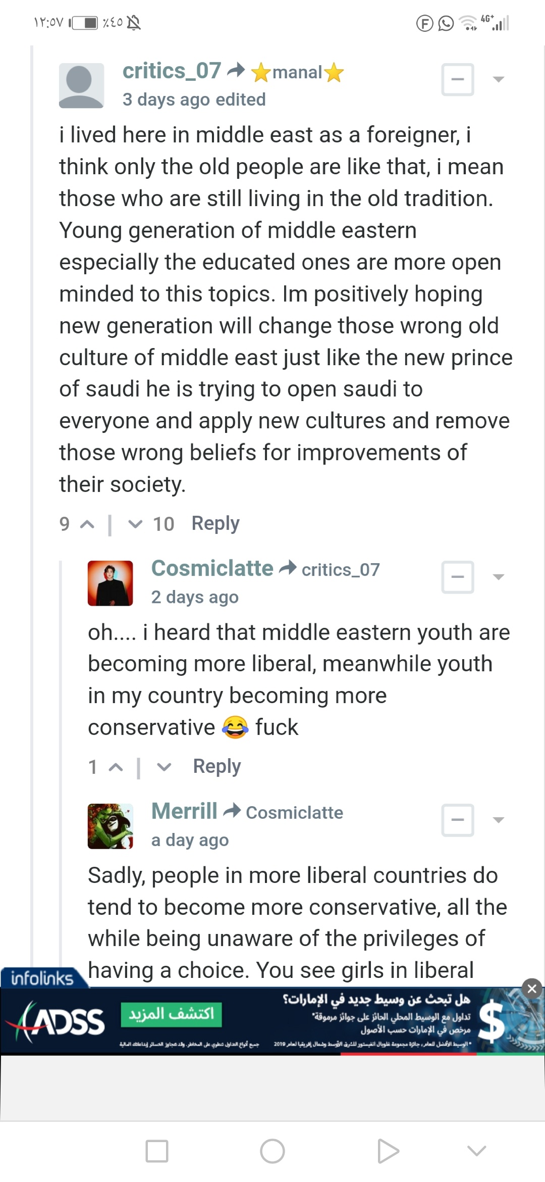 أذكر بعض نقاط اللي لاحظتها بالتعليقات عن السعوديه: ١/ ولاية الرجل : أحب أن أقول لك عزيزي العربي أسقطت ولاية الرجل على المرأة الآن في السعودية المرأه تولي نفسها وليس هناك أحد يتخذ القرارات عنها ، عندما تبلغ من العمر ١٨ يفتح لها حساب بنظام لدينا أسمه أبشر بحيث جميع معاملاتها الحكوميه من استخراج هويتها إلى إستخراج جواز السفر وتصريح السفر ، إستخراج رخصة القياده وقيادة السيارة جميعها تتم من المرأة فقط ولا يستطيع الرجل سواءً والدها او زوجها التدخل أو حتى إستلامه إلا بموافقه المرأه وتفويضها له كل هذا إحتراماً للمرأة وحفظاً لحقوقها ، ٢/ زواج القاصرات : بأي عصر تتكلمون! تم منع هذا الأمر ويترتب على من يزوج أطفاله القُصر عقوبات بالسجن والتغريم لذلك لا تتكلم يالجاهل بما لا تعلمه ، ٣/ عمل المرأه عندما يقولون فصل المرأه عن الرجل ، هذا شئ طبيعي هل أتيتي للعمل أم المغازله عزيزتي الجاهله وصدقيني لن تجدي بمثل السعوديه من يحترم عمل المرأه ويسن قوانين خاصه بأوقات عمل المرأه رحمتاً بها وخصوصاً للحامل وأجرها مساوي لأجرالرجل بل الرجل يعمل وقتاً أكثر من المرأة لديناً لطبيعة الجسد بأن الرجل أكثر قوةً من المرأه ويتحمل أكثر ، ٤/ نصت قوانين صارمه ورادعه للتحرش الجنسي للطرفين بحيث لم تظلم الرجال واصطفت مع النساء فقط! بل نصت القوانين على كلا الجنسين من سجن وغرامه سواء تحرش لفظي أو جسدي وقوانين صارمة للمحافظه على الصوره العامه للأماكن والزي الرسمي بكل مكان وتحديد العقوبات ، ٥/ اللبس : لباسنا وسترنا لعورتنا نابع من ديننا الإسلام وليس للدوله دخل فيه نحفظ أنفسنا لنفسنا ولله ولزوجي المقدر لي ، كرمنا الله بالإسلام حفظاً وحشمة لنا من الفواحش