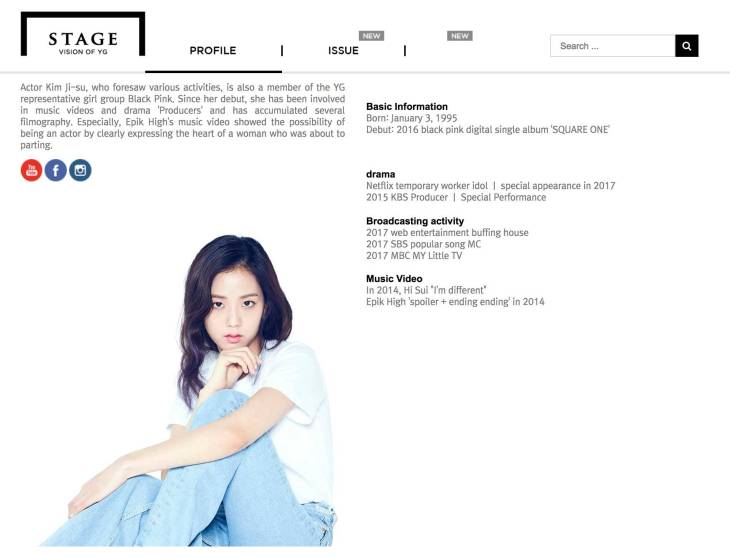 لاحظ المعجبين أن جيسو (Jisoo) عضوة فرقة بلاكبينك (BLACKPINK) قد أُزيلت من صفحة YG Stage وهي وكالة فرعية تابعة لوكالة YG الترفيهية ومتخصصة في إدارة الممثلين.