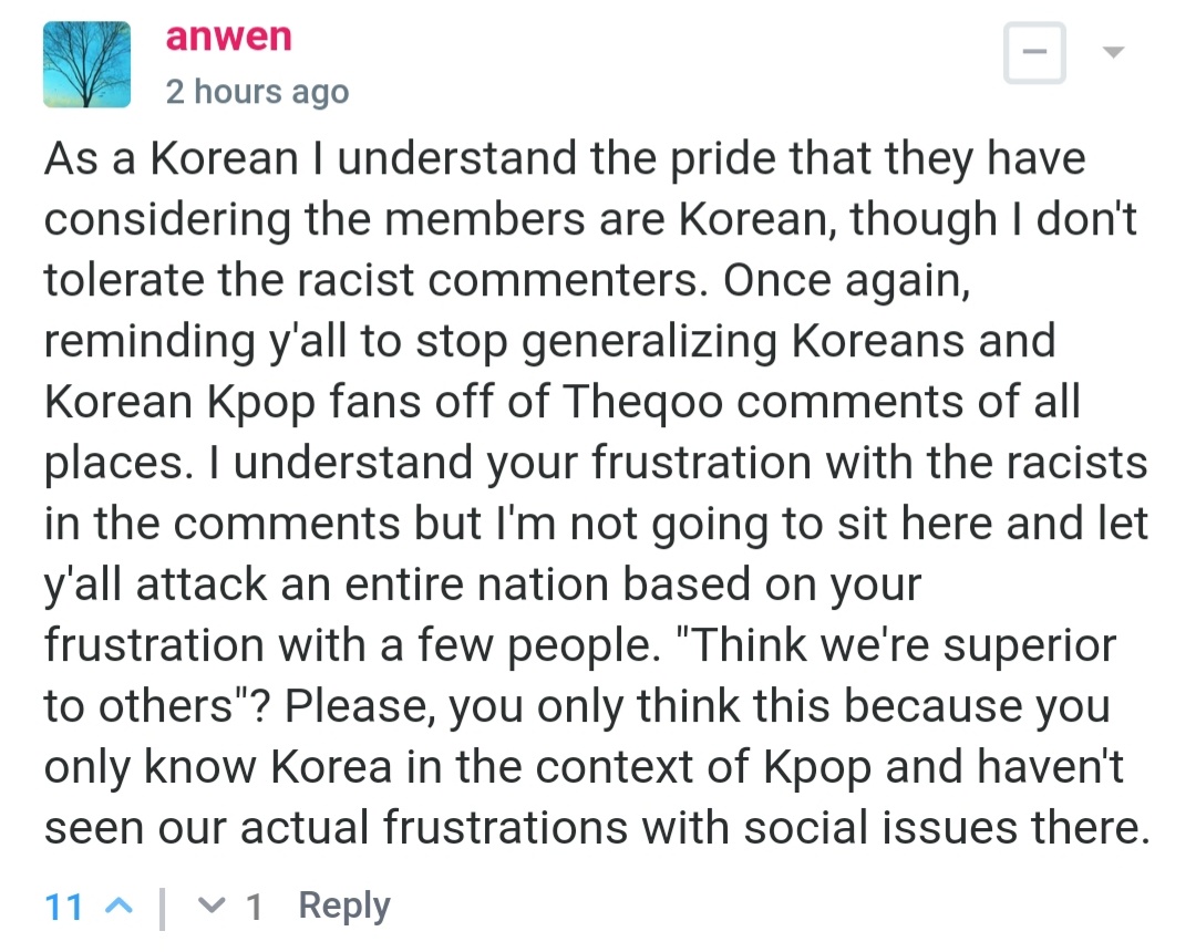 مع انتشار شهرة الكيبوب و الدراما الكورية و كثرة السياحة و الدولة في عيون الناس و المعجبين في التوب لست أصبح عندهم غرور و شايفين نفسهم كالافضل في كل شي. لكن لما الواحد يسألهم أبسط سؤال عن اي ثقافة أخرى ما يقدروا يجاوبوا لانهم غير مهتمين باي احد غير نفسهم. فماتستغربوا لو طلعت منهم إهانات لشعب او ثقافة هذا بسبب جهلهم و غرورهم.