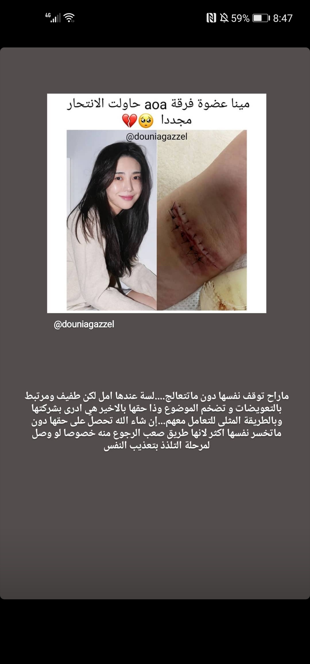 عجدت افهم هذي أدمية اذا كنت تريدي تموتي موتي في هدوء شو فايدة من كتابة منشور و تحطي صورة لرسغك مقطوع